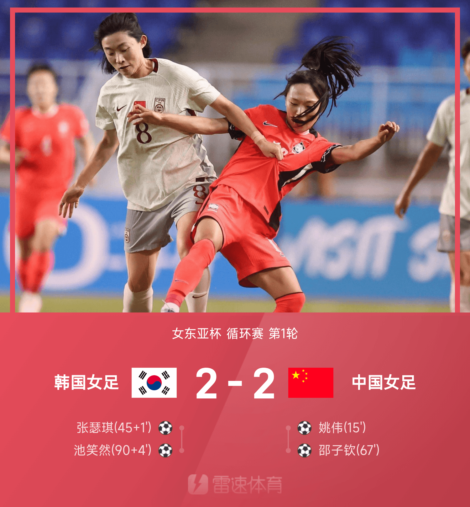 下半场补时第4分钟,池笑然禁区外世界波破门,韩国女足2-2中国女足。