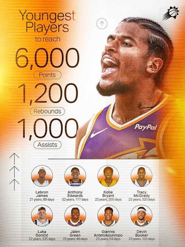 历史最年轻的6000分+1200篮板+1000助攻的球员前八:詹姆斯、爱德华兹、科比、麦迪、东契奇、杰伦-格林、字母哥、布克。