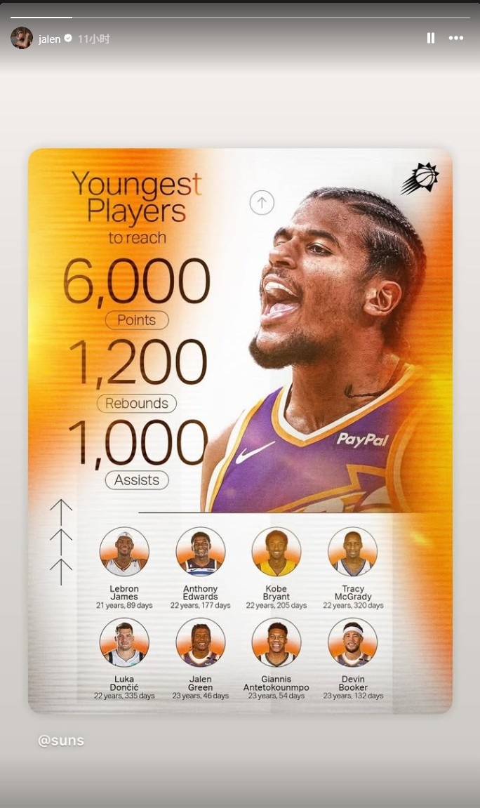 7月11日讯 太阳官方晒出一则新援杰伦-格林的数据统计。